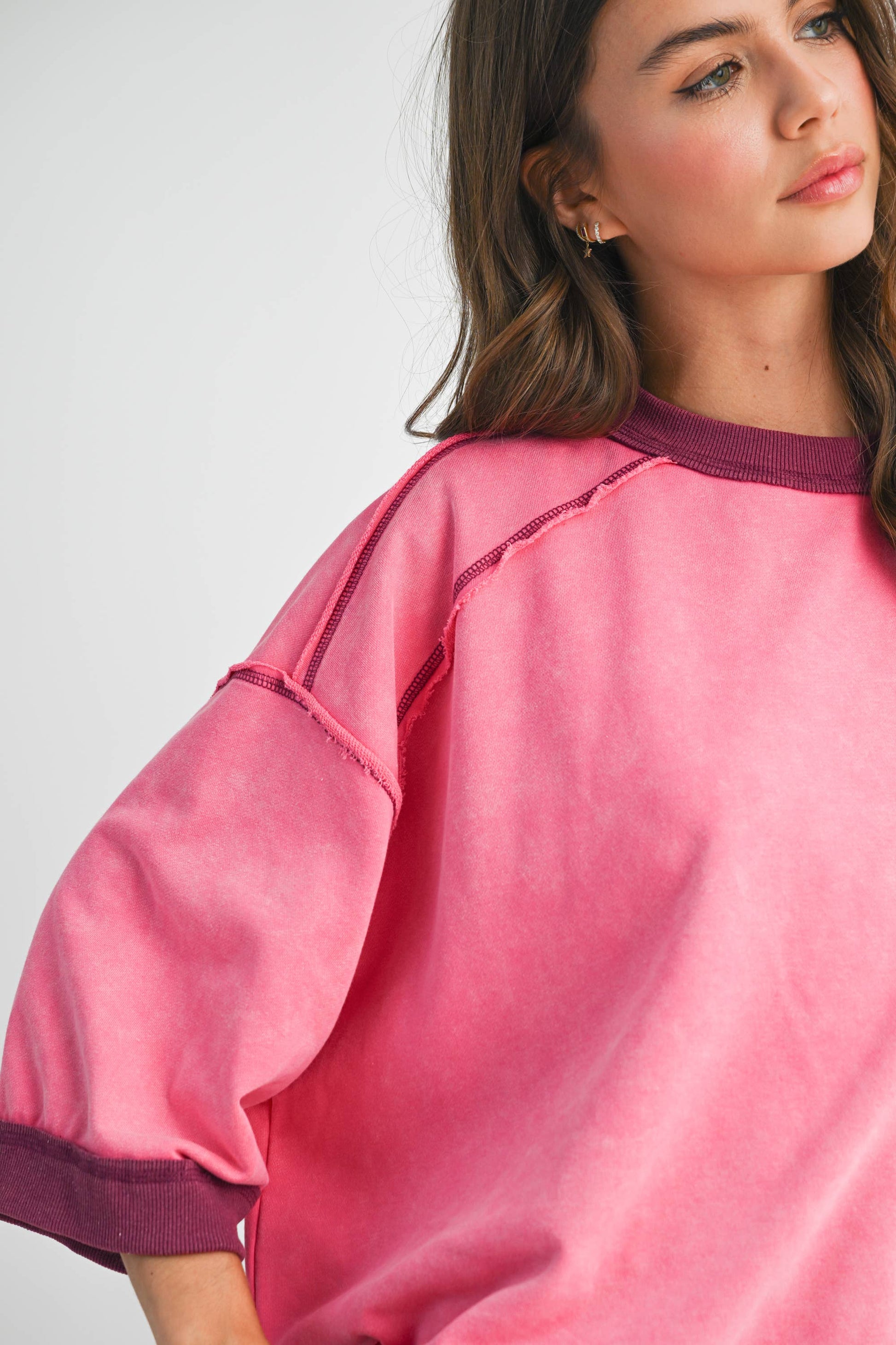 Brighten up your off-duty days with this effortlessly bold pullover. Featuring a boxy silhouette with washed fabric, contrast trim, and raw seam details, it’s a standout piece for cozy, laid-back styling. Throw it on with denim cutoffs or biker shorts for an easy, lived-in vibe.