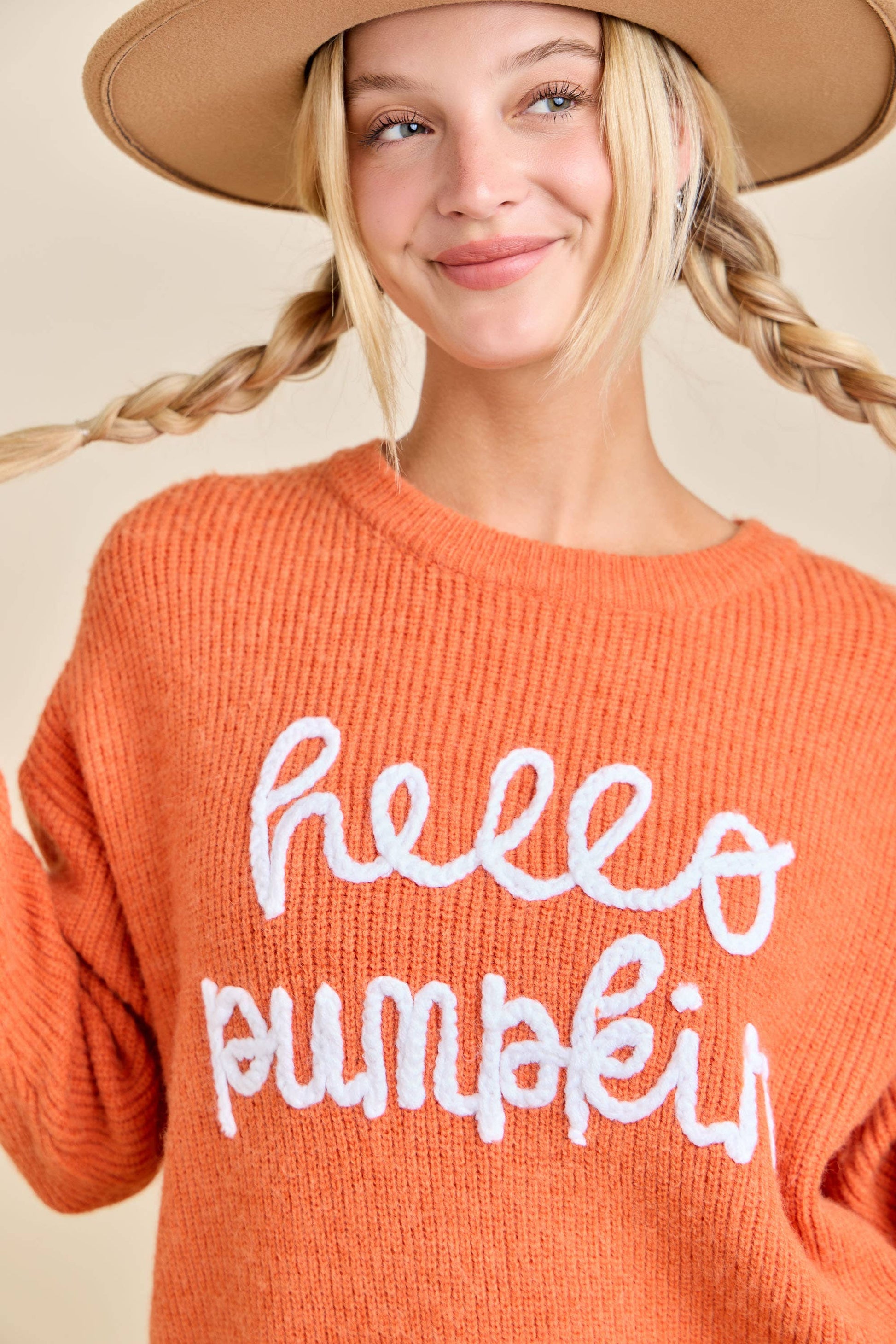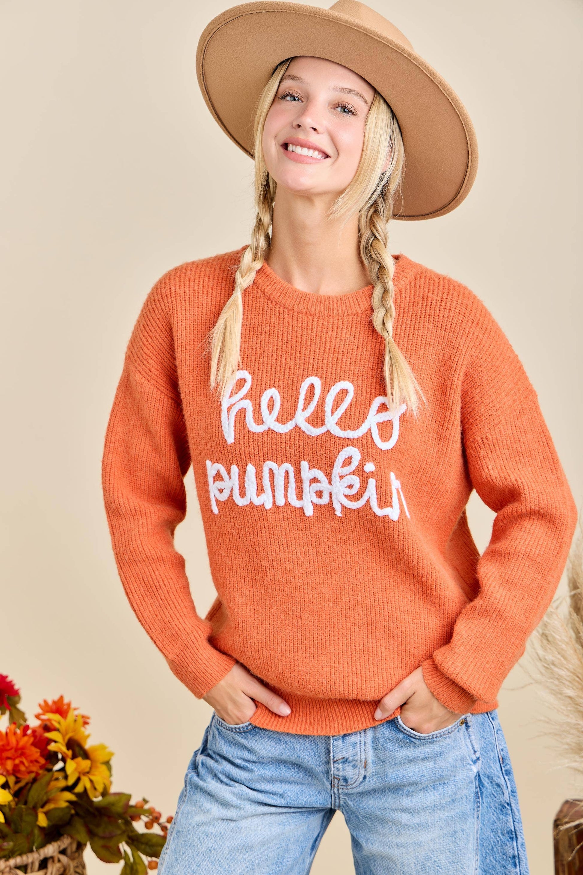 Hello Pumpkin Embroidered Knit Sweater – Fall Cozy Pullover