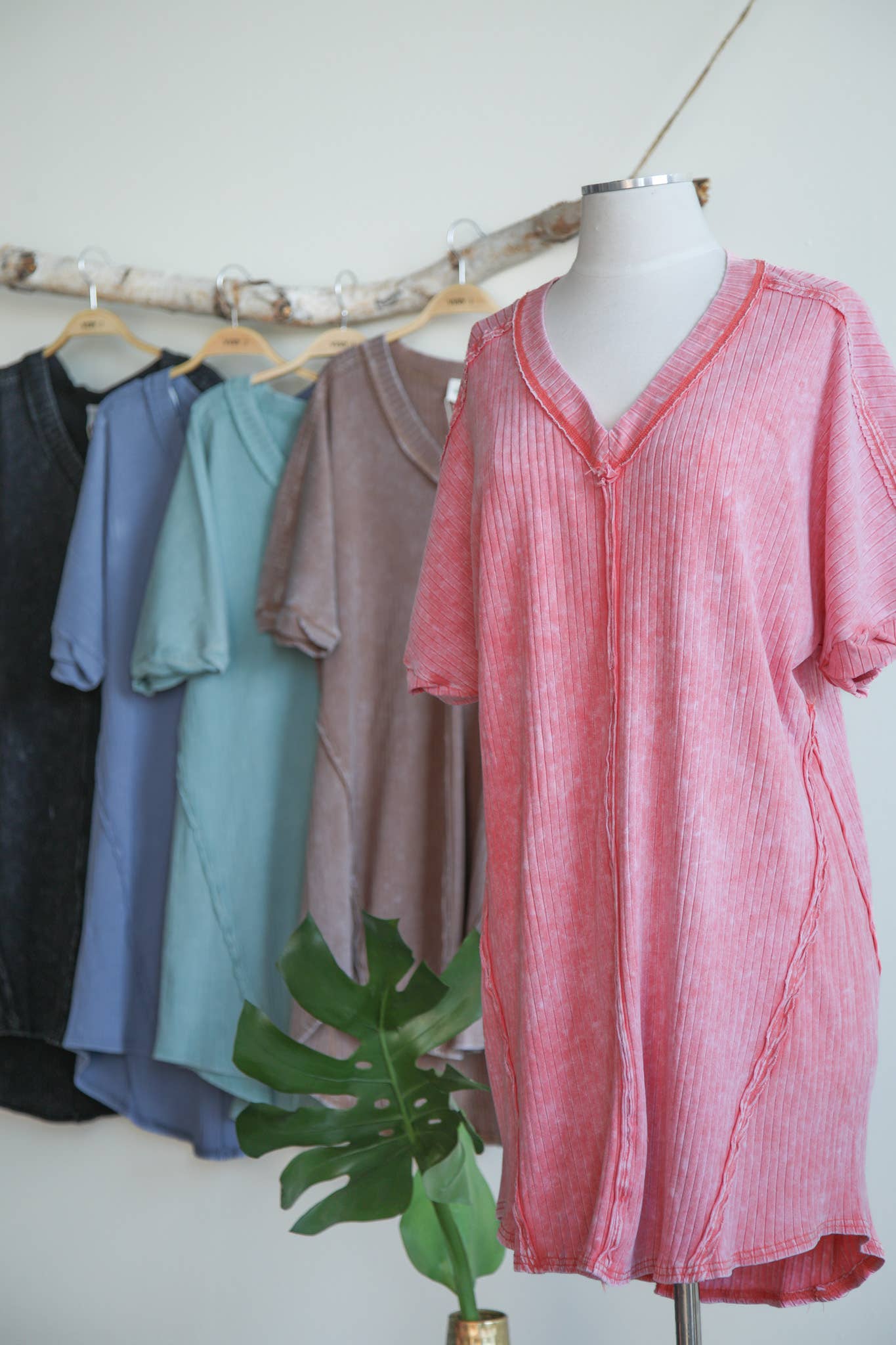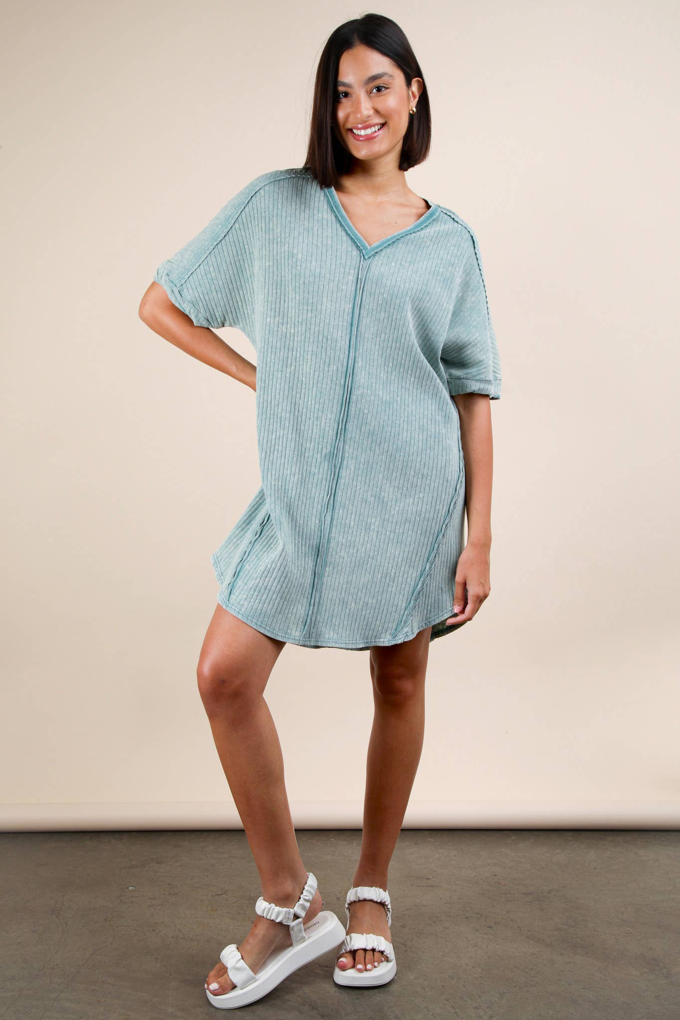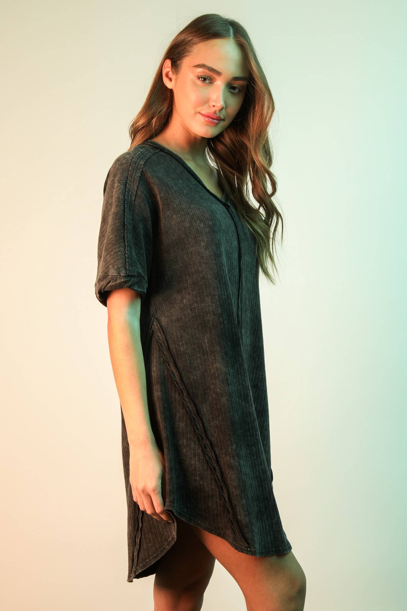 Mineral Washed Ribbed Knit Shift Mini Dress - V-Neck - Oversized - Drop Shoulder - Short Sleeve - Round Hi-lo Hem (Model height: 5"8", wearing a Small)